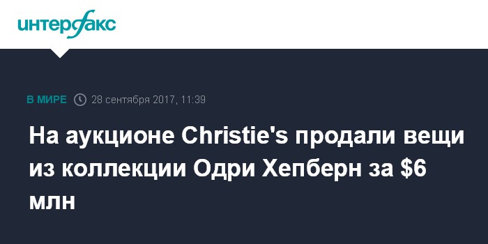 Москва. 28 сентября. INTERFAX.RU - Вещи из частной коллекции британской актрисы Одри Хепберн на аукционе Christie's в Лондоне продали за $6,21 млн (4,6 млн фунтов стерлингов), сообщают представители аукциона.