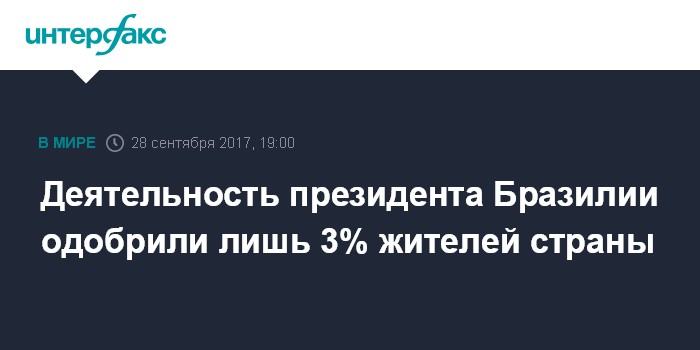 Москва. 28 сентября. INTERFAX.RU - Только 3% опрошенных бразильцев поддерживают президента страны Мишела Темера и его администрацию, свидетельствуют результаты опроса Бразильского института статистики и общественного мнения, которые опубликовало AP.