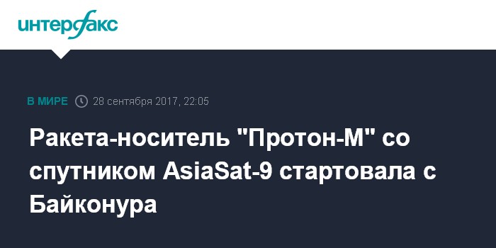 Москва. 28 сентября. INTERFAX.RU - Телекоммуникационный спутник AsiaSat-9 стартовал в четверг с Байконура на российской ракете "Протон-М".