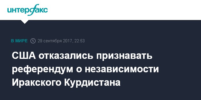"США не признают проведенный региональным правительством Курдистана в одностороннем порядке референдум. Голосование и его результаты не выдерживают критики с точки зрения легитимности, и мы продолжаем поддерживать единый, федеральный, демократический и процветающий Ирак", - говорится в нем.