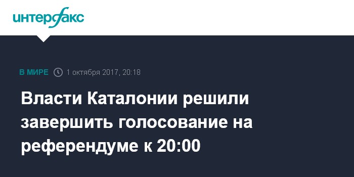 Москва. 1 октября. INTERFAX.RU - Власти испанского автономного сообщества Каталония приняли решение завершить процесс голосования на референдуме о независимости региона от Испании к 20:00 по местному времени (21:00 по московскому), сообщает сайт испанской газеты El País.