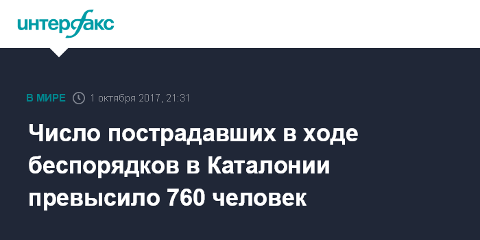 Москва. 1 октября. INTERFAX.RU - По данным министерства здравоохранения Каталонии, 761 человек пострадал в ходе беспорядков, связанных с проведением референдума о независимости региона от Испании, пишет в воскресенье вечером La Vanguardia.
