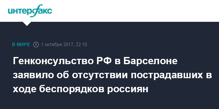 Москва. 1 октября. INTERFAX.RU - Граждане России не обращались за помощью в связи со столкновениями с полицией на фоне проходящего референдума о независимости Каталонии, сообщили "Интерфаксу" в генконсульстве РФ В Барселоне.