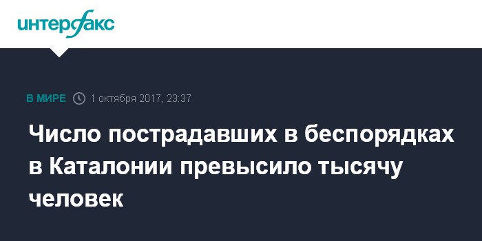 Москва. 1 октября. INTERFAX.RU - Более тысячи человек пострадали в результате столкновений с испанской полицией у избирательных участков в Каталонии, где в воскресенье проходил референдум о независимости региона от Испании, признанный Мадридом незаконным, сообщают органы здравоохранения региона.