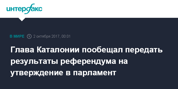Москва. 1 октября. INTERFAX.RU - Председатель женералитата (исполнительной власти) Каталонии Карлес Пучдемон заявил, что в ближайшие дни он передаст в региональный парламент результаты голосования о независимости от Испании для того, чтобы привести в действие механизм закона о референдуме, сообщает в воскресенье La Vanguardia.
