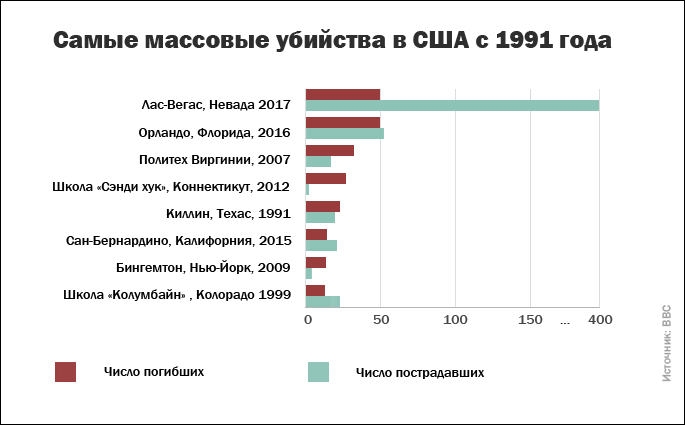 Москва. 2 октября. INTERFAX.RU - Стрельба по посетителям музыкального кантри-фестиваля в Лас-Вегасе, в результате которой погибли 50 человек и еще более 400 были ранены, стала самой кровопролитной в современной истории США, отмечает агентство Associated Press.