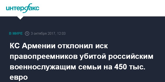 Москва. 3 октября. INTERFAX.RU - Конституционный суд Армении прекратил производство дела по иску правопреемников убитой российским военнослужащим Валерием Пермяковым в городе Гюмри семьи Аветисян.