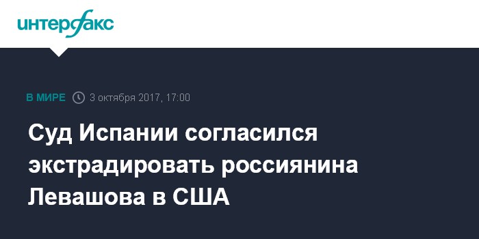 Москва. 3 октября. INTERFAX.RU - Национальный суд Испании санкционировал экстрадицию в США задержанного ранее россиянина Петра Левашова. Об этом сообщает во вторник агентство Bloomberg.