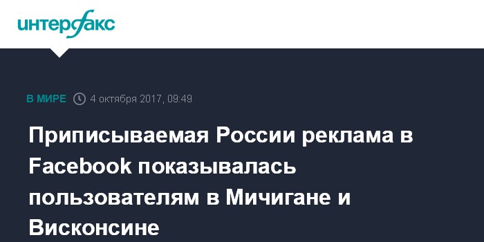 Москва. 4 октября. INTERFAX.RU - Рекламные объявления, которые предположительно были оплачены связанными с Россией фирмами в соцсети Facebook, демонстрировались пользователям в штатах Мичиган и Висконсин, сообщает в среду телеканал CNN со ссылкой на четыре источника.