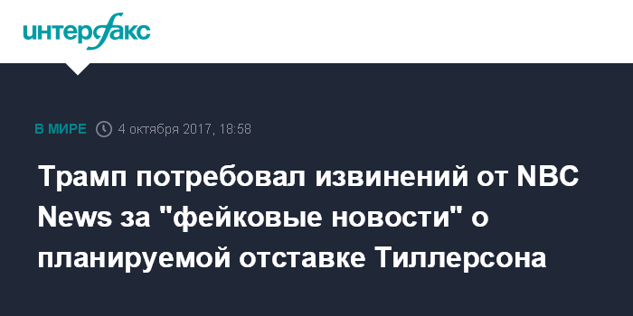 "Сообщения NBC News были полностью опровергнуты госсекретарем Тиллерсоном и вице-президентом Пенсом. Это фейковые новости. Они должны принести извинения перед Америкой!" - написал Трамп в твиттере.