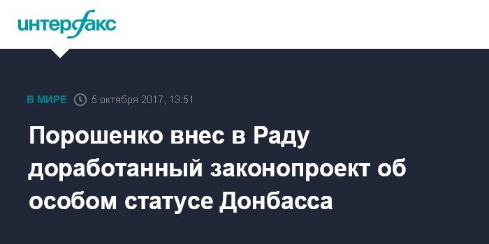 Москва. 5 октября. INTERFAX.RU - Президент Украины Петр Порошенко внес в украинский парламент доработанный законопроект "О создании необходимых условий для мирного урегулирования ситуации в отдельных районах Донецкой и Луганской областей", который продлевает особый статус территории.