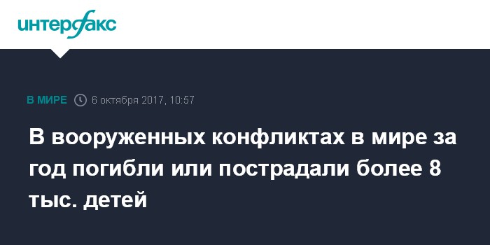 Москва. 6 октября. INTERFAX.RU - Более 8 тысяч детей погибли или пострадали в вооруженных конфликтах по всему миру в 2016 году, сообщает в пятницу агентство Associated Press (AP) со ссылкой на имеющийся в его распоряжении ежегодный доклад генсека ООН Антониу Гуттериша "Дети и вооруженные конфликты".