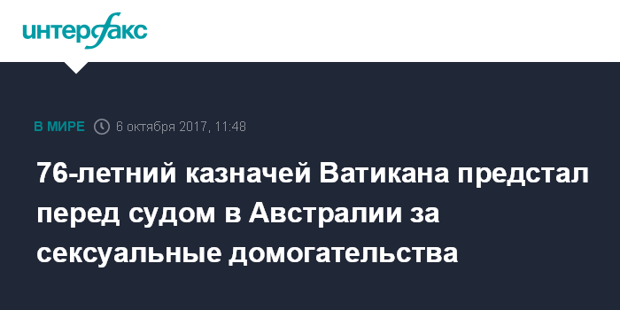 Москва. 6 октября. INTERFAX.RU - Начальник отдела финансов Ватикана и третий по значимости кардинал в католической церкви Джордж Пелл предстал в пятницу пред судом в Мельбурне по обвинению в совершении преступлений сексуального характера, сообщает агентство Associated Press.