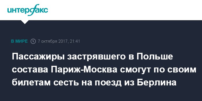 "Пассажирам поезда №24/453 Париж - Москва предоставлена возможность добраться до станций назначения в составах скоростного международного поезда №14 "Стриж"/Strizh сообщением Берлин - Москва по уже имеющимся проездным документам. В соответствии с расписанием поезда "Стриж"/Strizh отправятся в ближайшие рейсы из Берлина 8 и 9 октября в 18:50 и прибудут в Москву на следующие сутки в 19:11", - отмечается в сообщении.