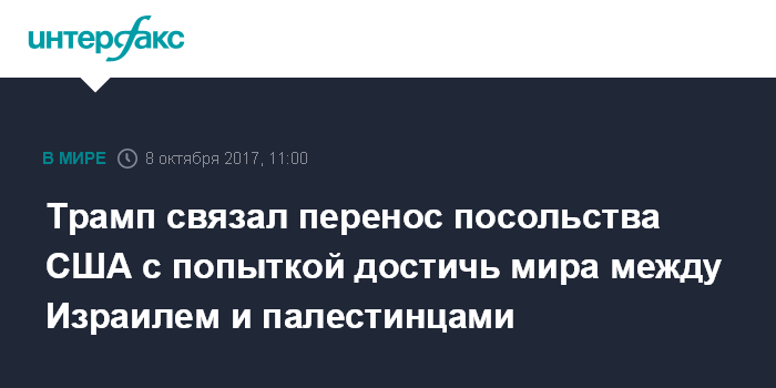 Москва. 8 октября. INTERFAX.RU - Президент США Дональд Трамп в воскресенье заявил, что перенос американского посольства из Тель-Авива в Иерусалим должно быть осуществлено лишь после очередной попытки урегулирования конфликта между Израилем и палестинцами.