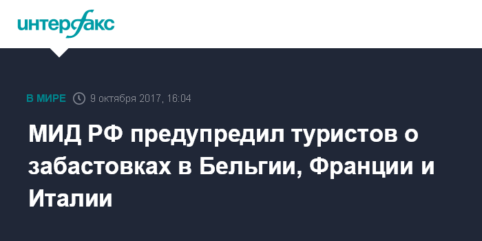 Москва. 9 октября. INTERFAX.RU - МИД РФ предупредил российских туристов о возможных сбоях в работе общественного транспорта и аэропортов из-за забастовок в Бельгии, Франции и Италии.