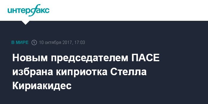 Москва. 10 октября. INTERFAX.RU - Новым председателем Парламентской ассамблеи Совета Европы (ПАСЕ) вместо ушедшего в отставку Педро Аграмунта избрана Стелла Кириакидес. Об этом говорится в заявлении ПАСЕ, опубликованном во вторник.