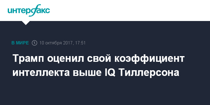 Москва. 10 октября. INTERFAX.RU - Президент США Дональд Трамп полагает, что коэффициент его интеллекта (IQ) выше, чем у госсекретаря США Рекса Тиллерсона.