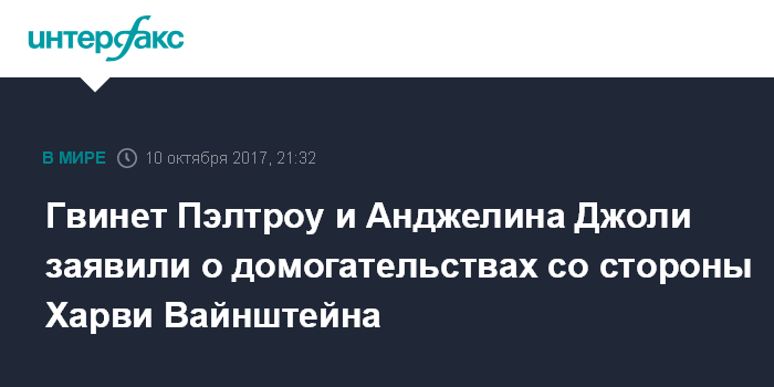 Москва. 10 октября. INTERFAX.RU - Голливудские актрисы Гвинет Пэлтроу и Анджелина Джоли присоединились к обвинениям в сексуальных домогательствах со стороны одного из самых влиятельных голливудских продюсеров, сооснователя The Weinstein Company и кинокомпании Miramax Films Харви Вайнштейна. Об этом сообщает во вторник газета The New York Times.