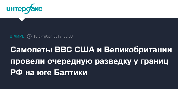 Москва. 10 октября. INTERFAX.RU - Стратегические разведывательные самолеты ВВС США и Великобритании во вторник осуществили многочасовые полеты вблизи границ Калининградской области, свидетельствуют данные западных авиационных сайтов, отслеживающих передвижения военной авиации.