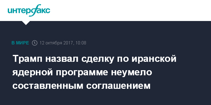 Москва. 12 октября. INTERFAX.RU - Президент США Дональд Трамп в интервью телеканалу Fox News заявил, что соглашение по ядерной программе Тегерана, по его мнению, не отвечает каким-либо профессиональным критериям.