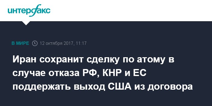 "Нам бы не хотелось, чтобы США выходили из сделки. Но, если это произойдет, то Иран будет смотреть на реакцию России, Китая, ЕС", - сказал собеседник агентства. "Если РФ и Китай это решение США не поддержат, то Тегеран останется верен своим обязательствам по СВПД", - отметил он.