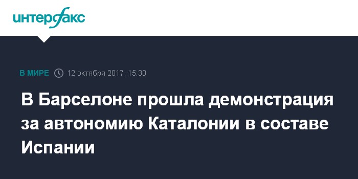 Москва. 12 октября. INTERFAX.RU - Тысячи людей вышли в четверг на улицы Барселоны в знак поддержки сохранения автономной Каталонии в составе Испании, сообщает агентство Associated Press.