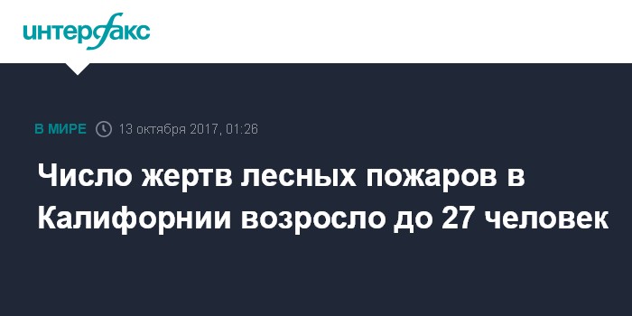 Москва. 13 октября. INTERFAX.RU - До 27 человек возросло число жертв лесных пожаров в Калифорнии, сообщает телеканал CNN со ссылкой на представителей власти.