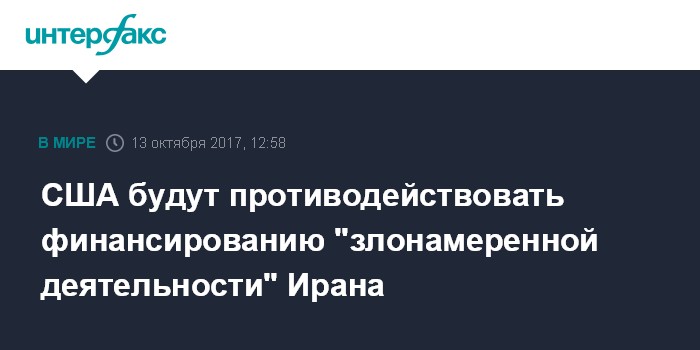 Москва. 13 октября. INTERFAX.RU - Вашингтон будет работать над тем, чтобы не допустить финансирования "злонамеренной деятельности" иранского режима, в особенности деятельности Корпуса Стражей Исламской революции (КСИР).