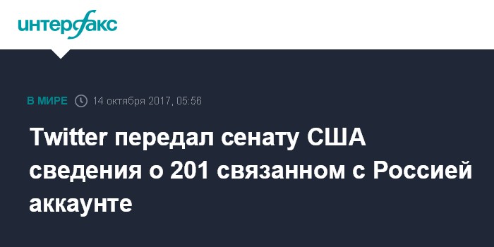 Москва. 14 октября. INTERFAX.RU - Сервис микроблогов Twitter передал комитету сената США по разведке сведения о 201 аккаунте, связанном с попытками России повлиять на президентские выборы 2016-го года, сообщает в пятницу агентство Associated Press.