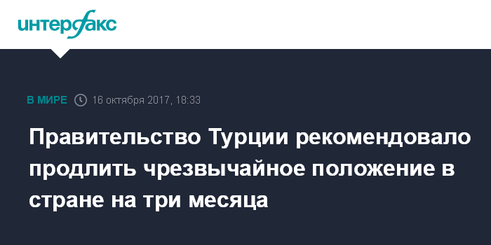 Москва. 16 октября. INTERFAX.RU - Правительство Турции рекомендовало парламенту продлить чрезвычайное положение в стране еще на три месяца, сообщает в понедельник Анатолийское агентство новостей.