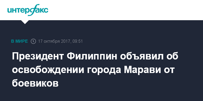 Москва. 17 октября. INTERFAX.RU - Президент Филиппин Родриго Дутерте объявил о полном освобождении города Марави от боевиков, связанных с террористической организацией "Исламское государство" (запрещена в РФ), сообщает во вторник CNN.