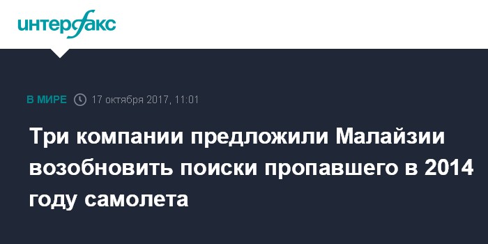 Москва. 17 октября. INTERFAX.RU - Три компании предложили властям Малайзии свои услуги в поисках самолета, следовавшего рейсом MH370 "Малазийских авиалиний" и пропавшего в 2014 году, сообщает во вторник The Guardian.