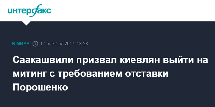 Москва. 17 октября. INTERFAX.RU - Прибывший на митинг у здания парламента Украины лидер "Руха новых сил", экс-глава Одесской областной государственной администрации Михаил Саакашвили призвал потребовать отставки президента Украины Петра Порошенко.