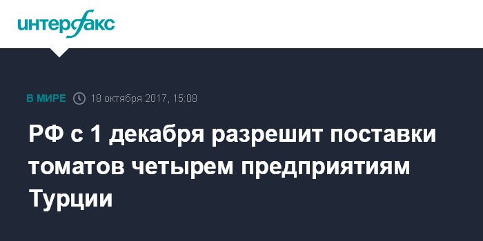 Москва. 18 октября. INTERFAX.RU - Россия с 1 декабря планирует разрешить поставки томатов с четырех турецких предприятий.