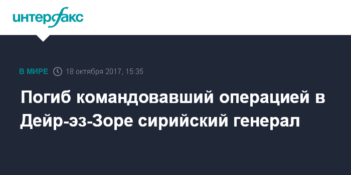 Москва. 18 октября. INTERFAX.RU - Сирийский генерал Иссам Захреддин, командовавший операцией в сирийском Дейр-эз-Зоре, погиб в среду, сообщает межарабское издание "Аль-Масдар".