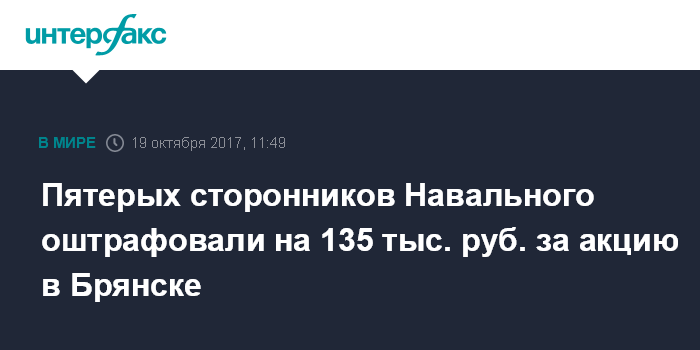 Москва. 19 октября. INTERFAX.RU - Советский районный суд Брянска обязал участника акции в поддержку Алексея Навального выплатить штраф в 75 тысяч рублей, еще четверо оштрафованы на 15 тысяч рублей каждый, сообщили "Интерфаксу" в региональном штабе оппозиционера в четверг.
