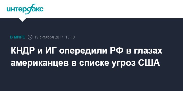 Москва. 19 октября. INTERFAX.RU - Большинство граждан США в настоящее время видят в Северной Корее большую угрозу, чем в террористической группировке "Исламское государство" (запрещена в РФ), России, Китае и Иране, свидетельствуют результаты совместного опроса телеканала NBC News и компании SurveyMonkey, опубликованного в четверг.