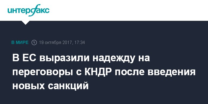 Москва. 19 октября. INTERFAX.RU - В Европейском союзе надеются, что введенные ранее новые ограничительные меры в отношении Северной Кореи приведут к мирным переговорам по денуклеаризации корейского полуострова, заявила в четверг глава европейской дипломатии Федерика Могерини.