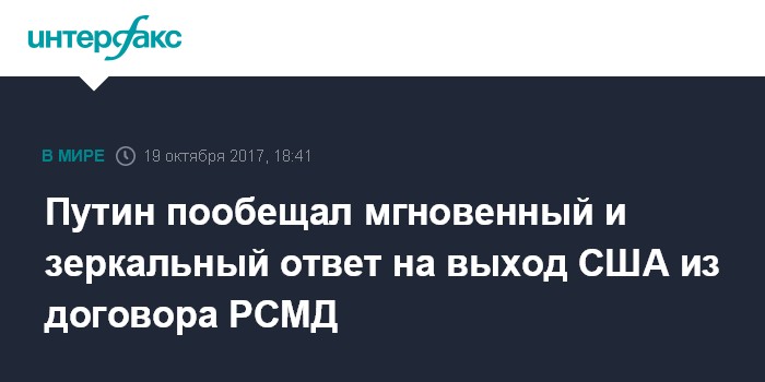 Москва. 19 октября. INTERFAX.RU - В случае выхода США из договора о ракетах средней и меньшей дальности ответ России будет мгновенным и зеркальным, заявил президент РФ Владимир Путин.