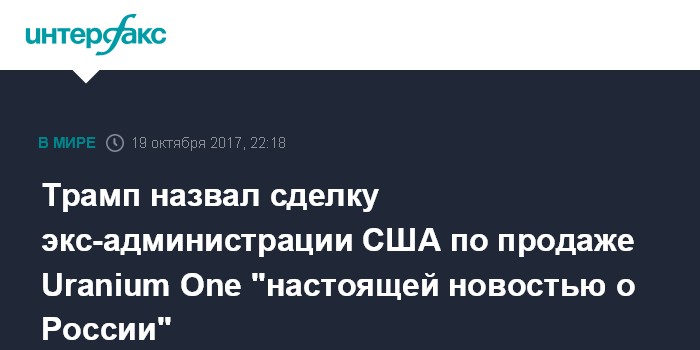 Трамп назвал эту тему "одной из важнейших историй десятилетия", которой должны интересоваться СМИ. При этом он подчеркнул, что такой темой не является предполагаемый "сговор" между его предвыборном штабом и российскими властями, которого, как подчеркнул Трамп, не было. "Это ложь. Ваша настоящая история о России - уран, и как они (Россия - ИФ) получили этот уран - значительный объем того, которым мы располагаем", - отметил президент.