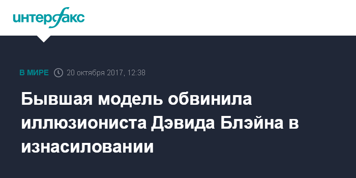 Москва. 20 октября. INTERFAX.RU - Бывшая британская модель Наташа Принс выступила с обвинениями против американского иллюзиониста Дэвида Блэйна, заявив, что он ее изнасиловал. Об этом сообщает газета Daily Beast. По словам Принс, это случилось летом 2004 года, после того как ей исполнился 21 год, в частном доме в лондонском районе Челси.