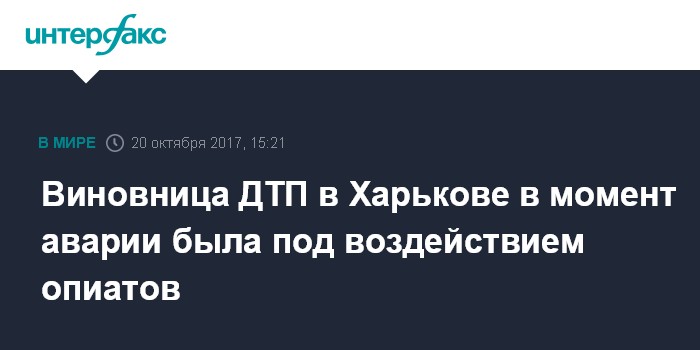 Москва. 20 октября. INTERFAX.RU - Жительница Харькова Елена Зайцева - водитель Lexus, который 18 октября в центре города въехал в пешеходов и стал причиной гибели 5 человек, в момент совершения ДТП была под воздействием опиатов.