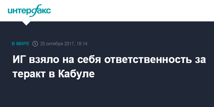 Москва. 20 октября. INTERFAX.RU - Террористическая группировка "Исламское государство" (ИГ, запрещена в РФ) взяла на себя ответственность за теракт в столице Афганистана Кабуле, который унес жизни по меньшей мере 30 человек, передает в пятницу иранский телеканал Press TV.