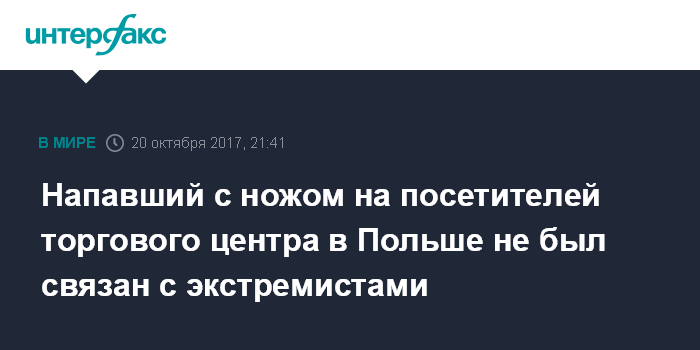Москва. 20 октября. INTERFAX.RU - Напавший на посетителей торговой галереи с ножом в польском городе Сталева Воля мужчина не связан к террористами или радикалами, сообщает в пятницу польский телеканал ТВН24 со ссылкой на представителя местной полиции Кшиштофа Побуту.