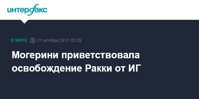 Москва. 21 октября. INTERFAX.RU - Оккупация сирийской Ракки ИГ (запрещенной в России организацией - ИФ) завершилась благодаря совместным усилиям Сирийских демократических сил и глобальной коалиции по противодействию ИГ, заявила верховный представитель ЕС по иностранным делам и политике безопасности Федерика Могерини.