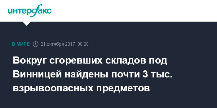 Москва. 21 октября. INTERFAX.RU - По состоянию на утро субботы на военных складах вблизи г. Калиновка (Винницкая обл.), открытых очагов горения и взрывов боеприпасов не наблюдается, сообщили в Госслужбе по чрезвычайным ситуациям.
