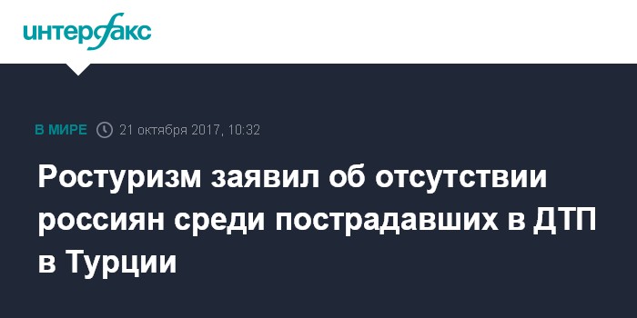 Москва. 21 октября. INTERFAX.RU - Россиян не было среди пострадавших в ДТП с туристическим автобусом в Турции, сообщает в субботу пресс-служба Ростуризма.