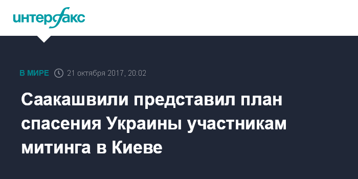 Москва. 21 октября. INTERFAX.RU - Лидер "Руха новых сил" Михаил Саакашвили презентовал свой "План спасения Украины" перед сотней участников акции у здания Верховной рады в субботу.