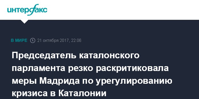 Москва. 21 октября. INTERFAX.RU - Председатель парламента Каталонии Карме Форкаделл в субботу подвергла критике действия властей Испании.